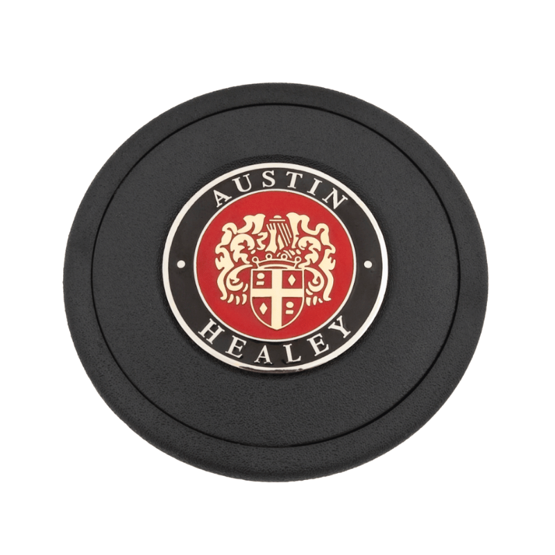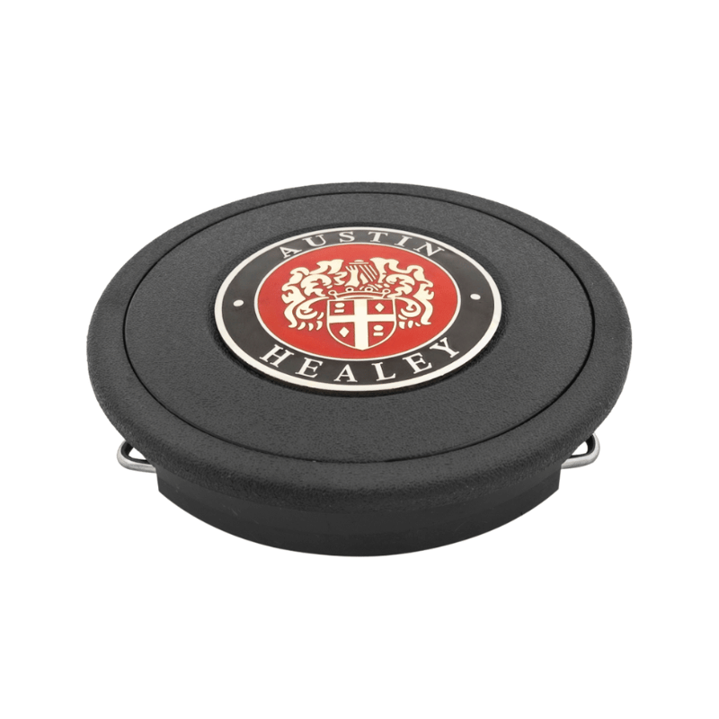 Centro de volante em plástico para vários modelos Austin-Healey. Inclui conector para buzina.