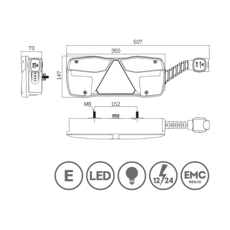 7 funções (2x presença em LED, stop, pisca, refletor, marcha atrás e nevoeiro).