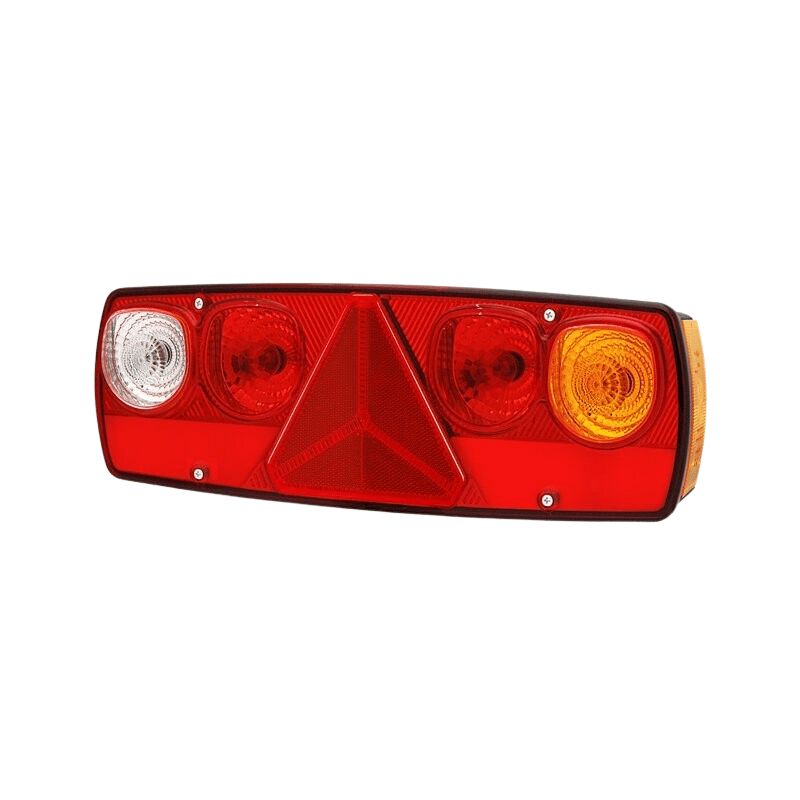 Farolim multifunções para camião, reboque ou atrelado com refletor triangular (LED: presença, iluminação chapa de matrícula e luz de posição lateral ou delimitador. Lâmpada: stop, pisca, nevoeiro e marcha atrás).
