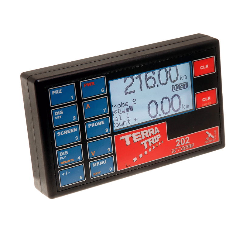 Le Terratrip GeoTrip 202 est un compteur de distance double précis pour les rallyes et les courses automobiles, avec lecture de vitesse. Cette version intègre un GPS qui permet la localisation à l'aide de jusqu'à 48 satellites connectés simultanément. Ce type de mesure GPS peut donner une précision extrêmement élevée, généralement avec une erreur maximale de 0,2 % de la distance parcourue. Le GeoTrip 202 est un appareil avec une précision bien supérieure à celle du GPS d'un smartphone ou de la plupart des appareils de navigation par satellite pour voiture.