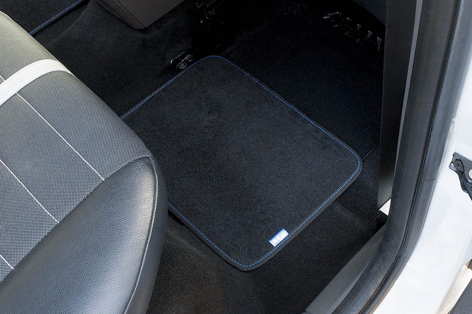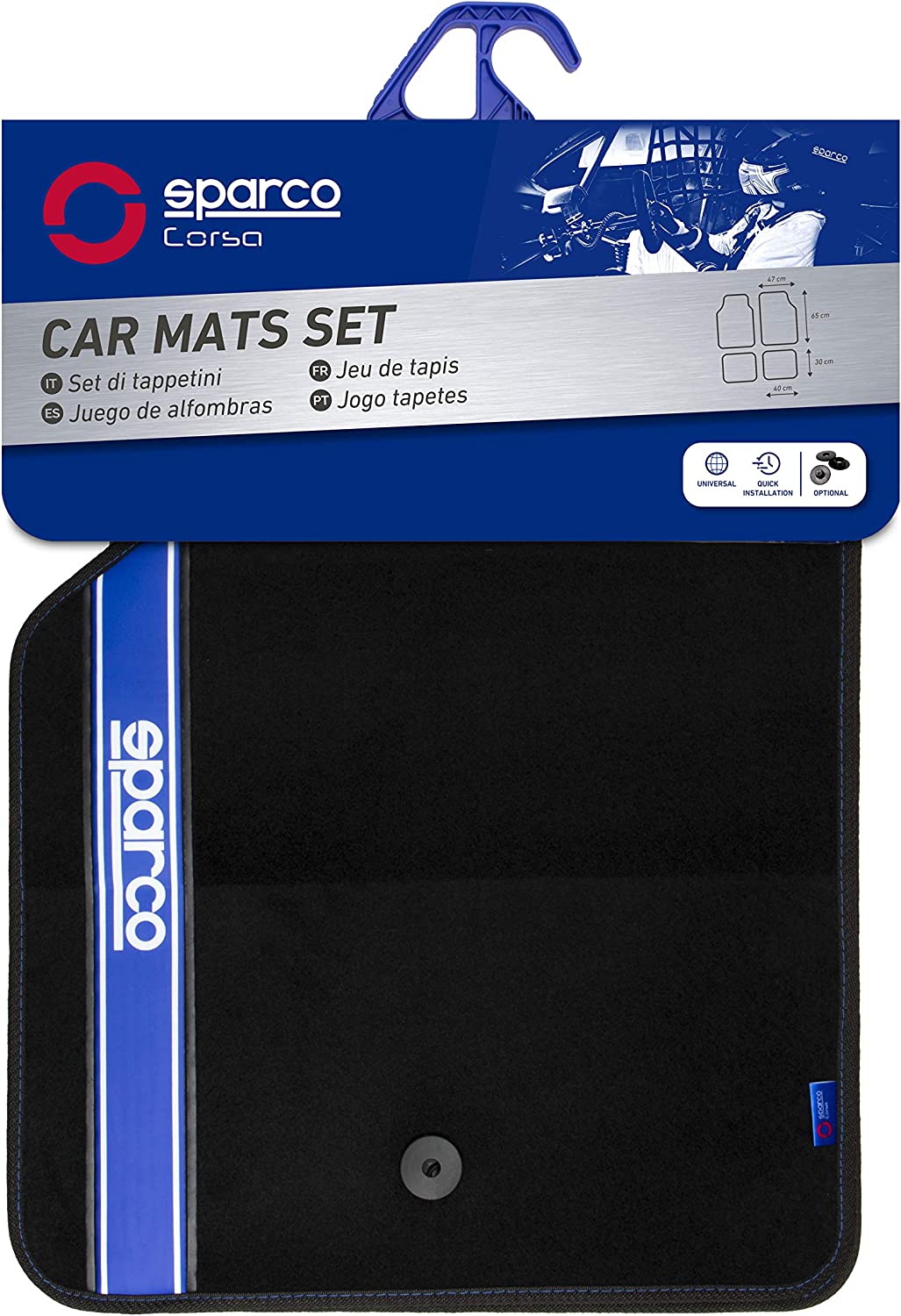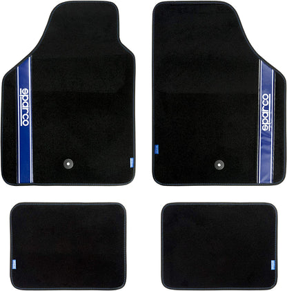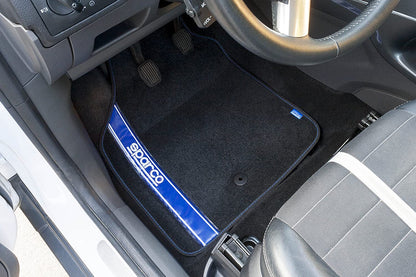 Conjunto de tapetes Sparco New Strada, tipo alcatifa, com banda em azul.