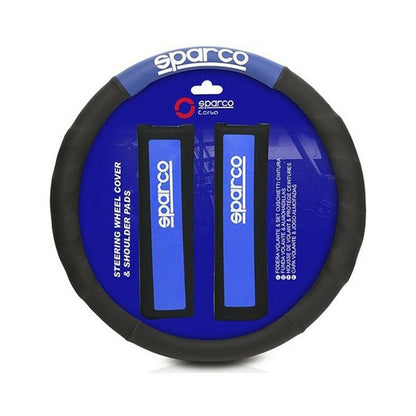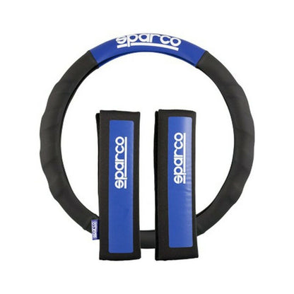 Kit especial de capa para volante Sparco SPC1111, com parte superior em azul de 38 cm de diámetro e duas almofadas para cinto Sparco da mesma cor.